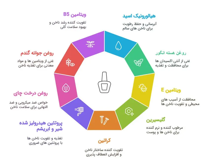 - حاوی روغن جوانه گندم : روغن جوانه گندم به طور طبیعی سرشار از ویتامین های A، D و E است و سرشار از ویتامین ها و اسیدهای چرب ضروری است که به محافظت از ناخن ها کمک می کند.